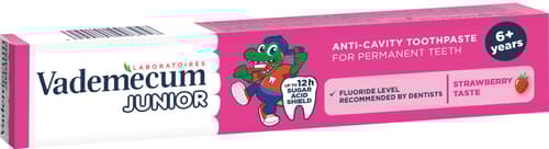 Dětská zubní pasta s jahodovou příchutí je určena pro děti od 6 let.