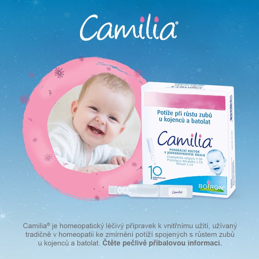 CAMILIA je homeopatický léčivý přípravek užívaný tradičně v homeopatii ke zmírnění potíží spojených s růstem zubů u kojenců a batolat (jako jsou např. bolesti při prořezávání zubů, podrážděnost, červené tváře, průjem). Pokud se vaše dítě do 3 dnů nebude cítit lépe nebo pokud se mu přitíží, musíte se poradit s lékařem.