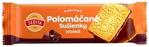 Sedita Rodinné sušenky jsou polomáčené v hořké čokoládě.