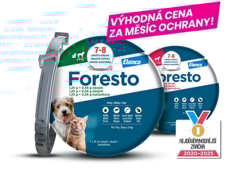 Veterinární přípravek. Foresto obojek pro psy nad 8 kg je vyhrazený veterinární léčivý přípravek, určen na léčbu a prevenci zablešení po dobu 7 až 8 měsíců. Přípravek odpuzuje klíšťata a hubí blechy i klíšťata po dobu 8 měsíců. Pro psy nad 8 kg hmotnosti. Pro použití na kůži. Patentovaná technologie řízeného uvolňování zajišťuje trvale nízkou dávku účinných látek. Voděodolný - před koupáním není nutné obojek sundávat. Bez zápachu. 1x70 cm dlouhý obojek.