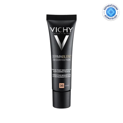 VICHY make-up Dermablend 3D odstín 35 SAND slouží ke kosmetické korekci a vyhlazení nedokonalostí pleti, s ochranným faktorem SPF 25. Snadno se aplikuje a vytváří přirozený vzhled bez efektu masky. Je určen pro všechny typy pleti a má trojí účinek: vysoká krycí schopnost plus autentický výsledek nalíčení plus optimální komfort. Obsahuje vysokou koncentraci pigmentů pro dokonalé krytí. Jemná textura zajišťuje snadné roztírání a perfektní splynutí s pletí a zajišťuje tak přirozený vzhled a krytí po dobu více než 16 hodin. Make-up obohacený o kyselinu salicylovou a eperulin viditelně pomáhá redukovat vznik nedokonalostí pleti. Pleť vypadá sjednoceně, je vyhlazená a zmatněná. Neucpává póry. Korekční make-up má hypoalergenní složení s vysokou tolerancí, dermatologicky testováno i na citlivé pleti. Balení: 30 ml.