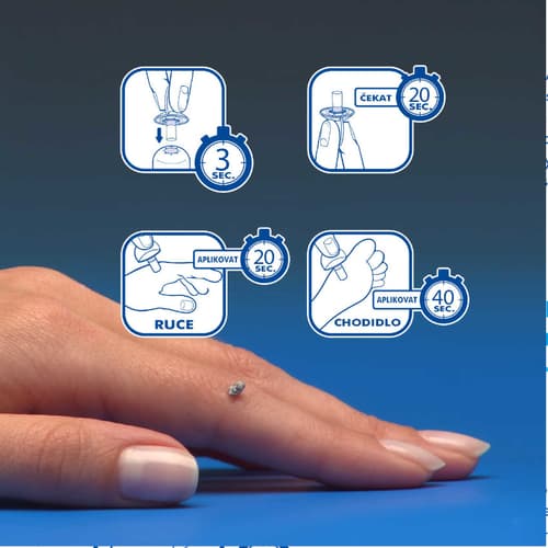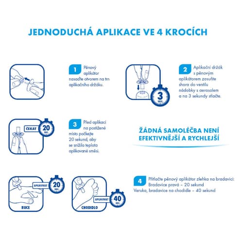 Dávkování: 1. krok: Pěnový aplikátor nasaďte otvorem na trn aplikačního držáku tak, aby trn nebylo vidět. 2. krok: Aplikační držák s pěnovým aplikátorem zasuňte shora do ventilu nádobky s aerosolem a na 3 sekundy stlačte. 3. krok: Před aplikací na postižené místo počkejte 20 sekund, aby se snížila teplota aplikované směsi, čímž se zvýší její účinnost. 4. krok: Přitlačte pěnový aplikátor zlehka na bradavici: Bradavice pravá - doba aplikace 20 sekund, bradavice na chodidle - doba aplikace 40 sekund.
