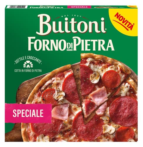 pšeničná mouka, sekaná rajčata 23%, sýr mozzarella 16%, uzený salám 8% (vepřové maso, jedlá sůl, konzervant: dusitan sodný, maltodextrin, dextróza, směs koření obsahující hořčici, antioxidanty: askorban sodný, výtažky z rozmarýnu, výtažky koření), houby 7% (žampiony), pitná voda, řepkový olej, uzená vařená šunka 2% (vepřová šunka, jedlá sůl, konzervant: dusitan sodný, dextróza, stabilizátor: citronany sodné, antioxidanty: askorban sodný, výtažky z rozmarýnu, výtažky koření), uzená papriková klobása 2% (vepřové maso, vepřový tuk, jedlá sůl, konzervant: dusitan sodný, směs koření, dextróza, antioxidanty: askorban sodný, výtažky z rozmarýnu, výtažky koření, cukr), droždí, cukr, sušený pšeničný kvásek, jedlá sůl, směs koření.
