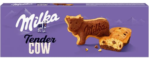 Milka Tender Cow jemné pečivo s kousky mléčné čokolády z alpského mléka a kakaovou vrstvou. Nyní v rodinném balení.
