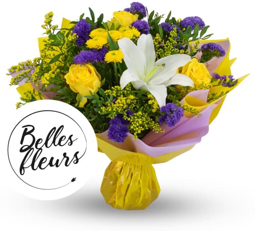 Zářivá kombinace lilie, růží, santin a dalších voňavých květů v kontrastních barvách žluté a fialové. Lilie má odstraněné pylové tyčinky, aby zmírnila intenzitu vůní a alergických reakcí.
