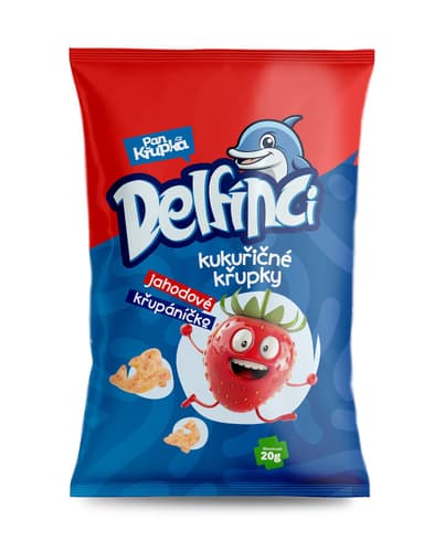 Křehké kukuřičné křupky ve tvaru delfínků s jahodovou příchutí si děti zamilují. Výrazná chuť jahod zaujme nejen děti, které vyhledávají sladkosti, ale i dospělé. S lyofilizovaným ovocem.