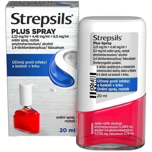 Strepsils Plus Spray je kombinovaný přípravek. Obsahuje dichlorbenzenmethanol a amylmetakresol, které mají antiseptické účinky a ničí bakterie, viry a kvasinky, způsobující bolesti v krku a záněty dutiny ústní. Lidokain je anestetikum, které mírní bolest místním tlumivým působením na nervová zakončení ve tkáních. Strepsils Plus Spray se používá k léčbě příznaků zánětlivých a infekčních onemocnění dutiny ústní a hltanu a k úlevě od bolesti v krku. Pokud se do 3 dnů nebudete cítit lépe nebo pokud se Vám přitíží, musíte se poradit s lékařem.