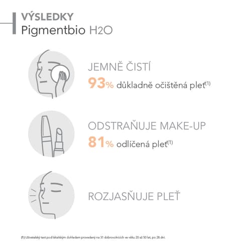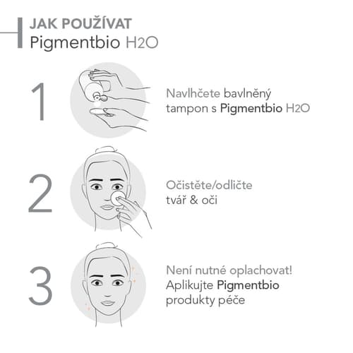 Bioderma Pigmentbio H2O je micelární voda působící proti pigmentovým skvrnám. Je speciálně vyvinuta pro pokožku s poruchami pigmentace, jemně čistí a odstraňuje make-up. Patentovaná kombinace aktivních složek reguluje biologické mechanismy, které způsobují tmavé skvrny na pokožce. Micelární voda jemně čistí a odstraňuje make up z tváře a očí. Micely, které obsahuje zabezpečují odstranění nečistot a zároveň respektují rovnováhu pokožky. Patentovaná kombinace aktivních složek reguluje biologické mechanismy a zabezpečuje zesvětlení pokožky. Velmi dobrá snášenlivost pokožky tváře a očního okolí. Bez parfemace. Velikost balení je 250 ml.