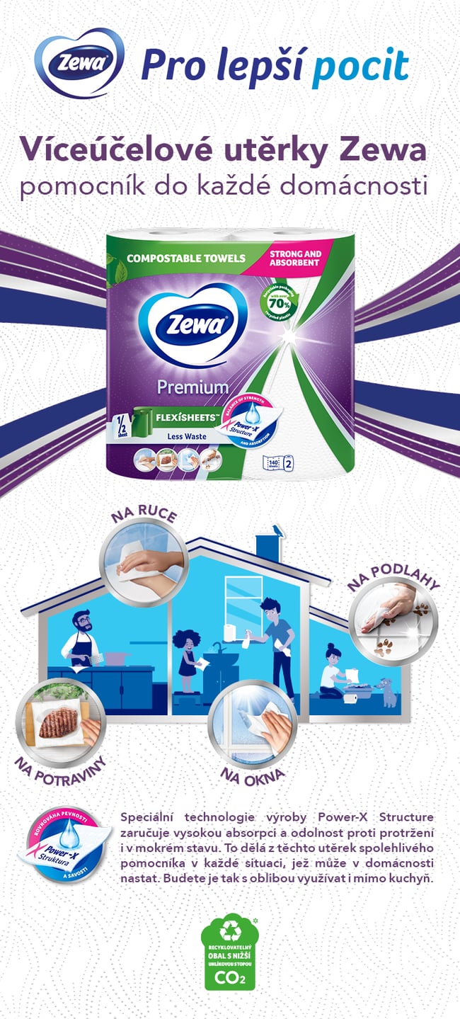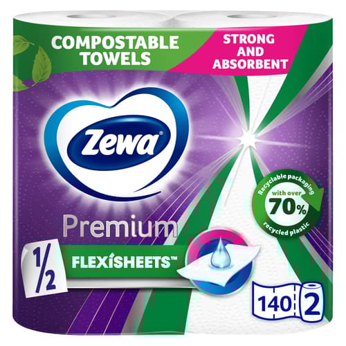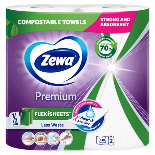 Dvouvrstvé utěrky Zewa Premium Flexisheets představují praktického pomocníka do každé domácnosti. Překvapí vás vysokou absorpcí a odolností proti protržení díky unikátní Power-X Structure. Obsahují 2 × 70 útržků a díky přidané perforaci je možné použít jen poloviční velikost útržku, a tak snížit plýtvání a množství odpadu. Utěrky se mohou chlubit certifikací FSC, což znamená, že výrobek pochází ze šetrně obhospodařovaných lesů. Výrobek má recyklovatelný obal.