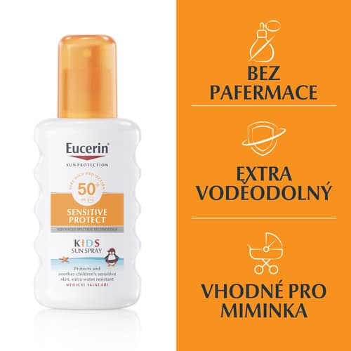 Eucerin Sun Dětský sprej na opalování Sensitive Protect s velmi vysokou ochranou SPF 50plus je dětské opalovací mléko, které díky obsaženým UVA/UVB filtrům chrání citlivou dětskou pokožku před spálením a snižuje riziko dlouhodobého poškození kůže vlivem slunečního záření. Extra voděodolné. Je vhodné pro atopickou pokožku. Neobsahuje parfemaci ani barviva. Složení s vysoce účinnými minerálními mikropigmenty chrání dětskou pokožku před spálením i chronickým poškozením způsobeným slunečním zářením. Mikropigmenty odráží UV paprsky, nepronikají do pokožky, a proto jsou ideální ochranou pro malé děti. Antioxidant voitamin E neutralizuje volné radikály a předchází jejich nepříznivému vlivu na pokožku. Dexpanthenol zvláčňuje a regeneruje pokožku. Pro děti a kojence od 3. měsíce života. Extra voděodolný. Balení obsahuje 200 ml.