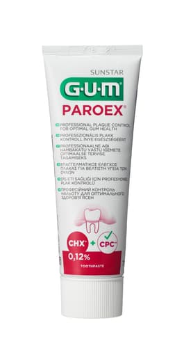 Zubní gel GUM PAROEX obsahuje chlorhexidin diglukonát (CHX 0,12%) pro profesionální odstranění zubního plaku a péči o zdravé dásně. Pomáhá zklidnit citlivé ďásně. Ideální před a po operačních výkonech, po extraktcích zubů a implantacích. Obsahuje antibakteriální cetylpyridinium chlorid (CPC 0,05%), který zvyšuje účinnost chlorhexidinu a napomáhá v ústech likvidovat toxiny, jež produkují bakterie. Dále obsahuje vitamín E, Aloe vera a pro-vitamín B5. Velikost balení je 75 ml.