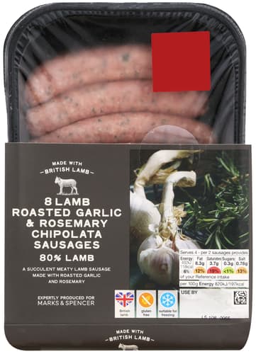 Marks & Spencer Britské jehněčí klobásy Chipolata s pečeným česnekem a rozmarýnem 8 ks