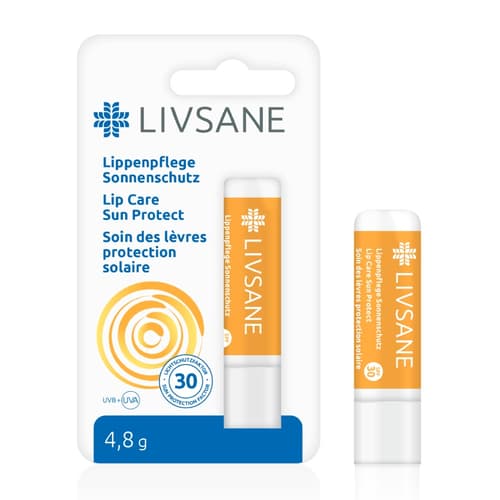 Livsane Balzám na rty Sun protect s ochranou UVA a UVB před slunečním zářením SPF 30. Neobsahuje konzervanty a parafin. Kožní snášenlivost byla dermatologicky testována. Balení obsahuje 4,8 g.