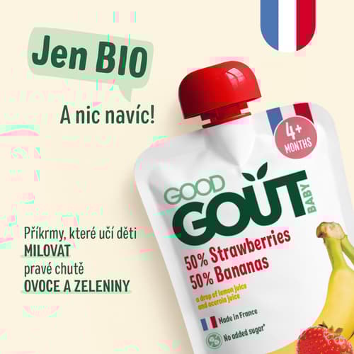 Good Gout je francouzský výrobce příkrmů, které jsou určeny pro kojence a malé děti. Všechny produkty obsahují jednu hlavní složku, která tvoří minimálně 60 % příkrmu. Výrobky jsou zároveň 100% organické, chutné a zdravé. Za tímto unikátním konceptem stojí rodiče, kteří chtějí pro své děti jen to nejlepší. Proto oslovili zkušené francouzské kuchaře a spolu nalezli originální receptury.