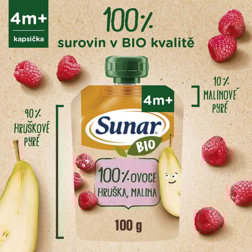 Sunar BIO kapsička s příchutí hrušek a malin je plná 100% vyzrálého a šťavnatého ovoce v nejvyšší BIO Baby kvalitě. Je vhodná pro děti od ukončeného čtvrtého měsíce věku, kdy poslouží jako první příkrm při zavádění ovoce a zeleniny do stravy dítěte.