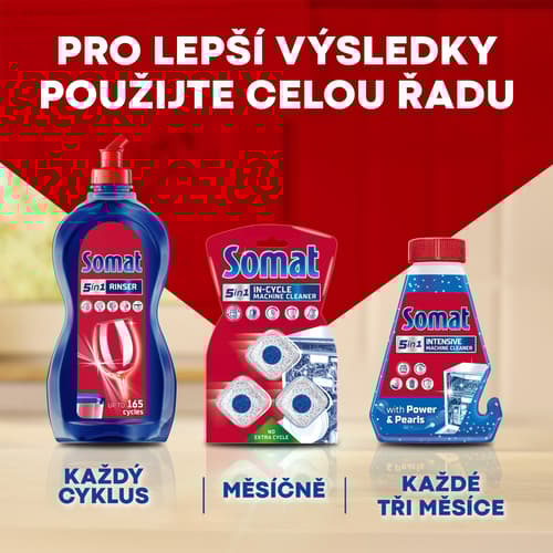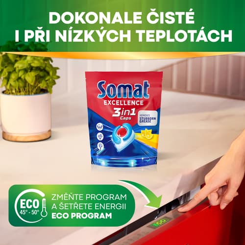 Kapsle na nádobí Somat 3v1 Lemon pro dokonalé čištění, zářivý lesk a proti zaschlým stopám po vodě. Složení kapslí kombinuje tři síly: hloubkové čištění pro rozpouštění připálených zbytků jídla a usazené mastnoty, žádné zaschlé stopy po vodě pro dokonalý lesk a ochranu choulostivého nádobí před korozí. Kapsle kombinují práškový mycí prostředek a tři pevné gelové komory v biologicky odbouratelné a ve vodě 100% rozpustné fólii. Jsou vhodné pro všechny talíře, sklenice, hrnky, láhve, hrnce, plasty a pánve, které lze mýt v myčce.