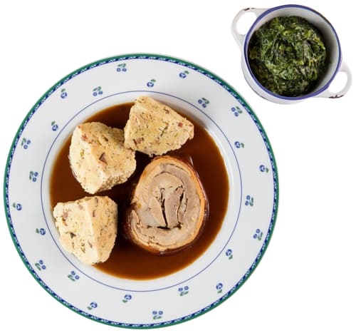 Rolovaný vepřový bůček s krémovým špenátem a špekovým knedlíkem z Babiččiny zahrady