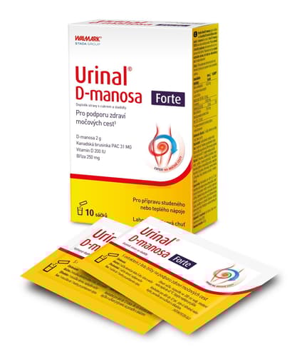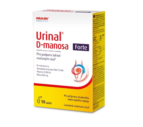 Doplněk stravy. Walmark Urinal D-manosa Forte je doplněk stravy dostupný v sáčcích ve formě prášku rozpustného ve vodě. Dle vaší preference ve studené nebo teplé. Obsahuje vysoký obsah D-manosy a patentovanoou kombinaci kanadských brusinek a vitaminu D. Dále obsahuje extrakt z listu břízy a jsou použita náhradní sladidla, mannitol, xylitol a Erylite - směs extraktu stevie a erythritolu, která činí přípravek šetrným k Vašim zubům. Neobsahuje konzervanty, barviva, lepek, laktózy, včelí produkty. Výborná malinová chuť a příjemná vůně. Vitamin D přispívá k udržení zdravých kostí, zubů a normálních svalových funkcí, k normální funkci imunitního systému u dětí i dospělých. Brusinka obecná je antioxidant podporující přirozenou obranyschopnost. Bříza bělokorá podporuje normální funkce močových cest - ledviny. Nepřekračujte doporučené denní dávkování. Uchovávejte mimo dosah dětí. Doplňky stravy nejsou náhradou pestré stravy. Nevhodné pro děti do 12 let. Balení obsahuje 10 sáčků.