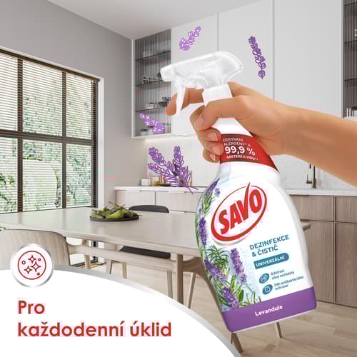 Vyzkoušejte Savo univerzální sprej Levandule, který účinně čistí i dezinfikuje. Svěží vůně levandule provoní celou vaši domácnost. Vůně je 100% biorozložitelná a sprej je dermatologicky testován.