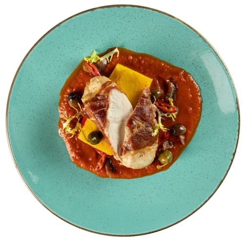 Kuřecí Saltimbocca, polenta s Parmigiano Reggiano a omáčka puttanesca z Aureole