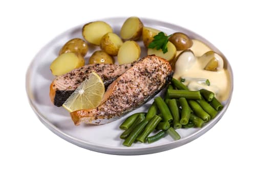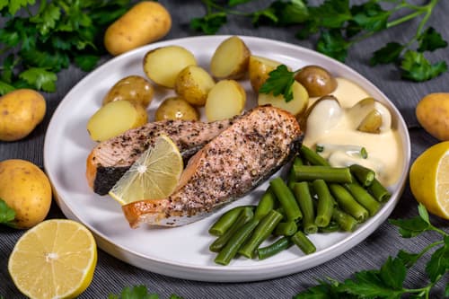 Pečený losos s holandskou omáčkou, bramborami a fazolkami