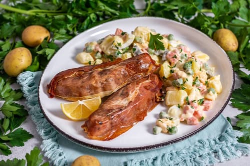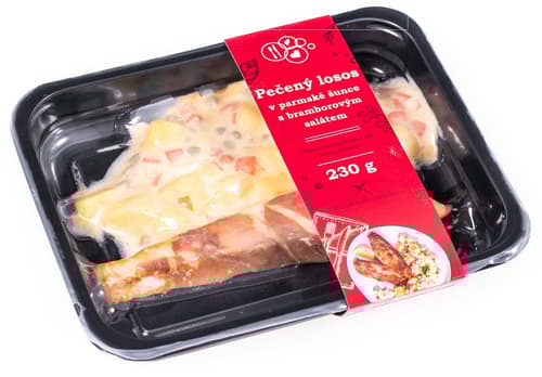 Pečený losos v parmské šunce s bramborovým salátem se zeleninou