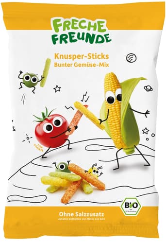 Freche Freunde BIO Zeleninové tyčinky s rajčetem, kukuřicí a hráškem