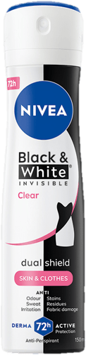 Nivea B&W Invisible Clear Antiperspirant Spray nabízí spolehlivou 48hodinovou ochranu proti pocení a zápachu. Díky unikátní technologii nezanechává žluté skvrny na bílém ani bílé stopy na černém oblečení. S atraktivní květinovou vůní a dermatologicky testováno, pečuje o pokožku podpaží. Německý výrobek v balení 150 ml.
