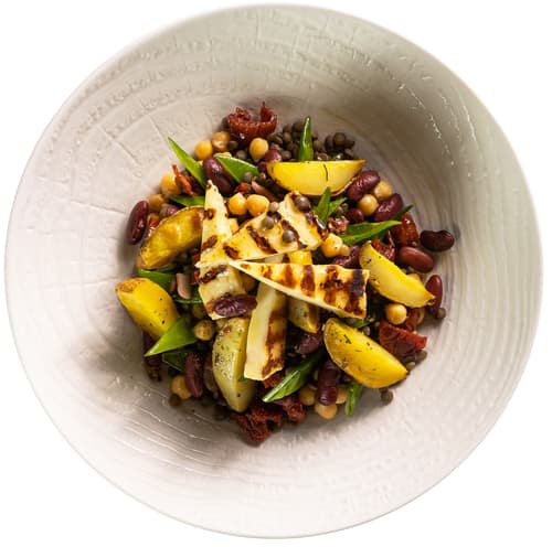 Luštěninový salát s grilovaným sýrem a zaatarem ze Spojky Karlín