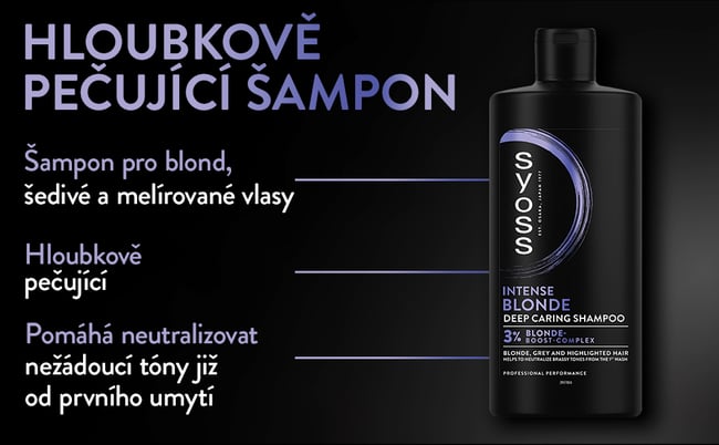 Šampon na vlasy Syoss Intense Blonde je vhodný pro blond, šedivé a melírované vlasy. Jeho složení s 3% Blonde boost-komplexem pomáhá neutralizovat nežádoucí tóny již od prvního umytí. Zároveň zajišťuje zářivý lesk vlasů.