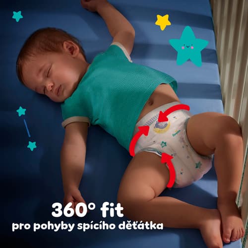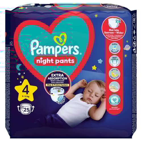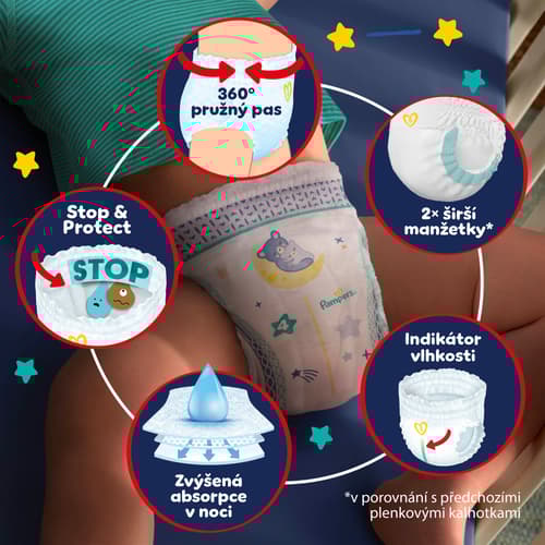 Plenkové kalhotky Pampers Night Pants poskytují až 12hodinovou kompletní extra ochranu proti protečení pro klidný spánek po celou noc. Nyní totiž přicházejí s kapsou Stop & Protect, která pomáhá předcházet protečení vzadu.