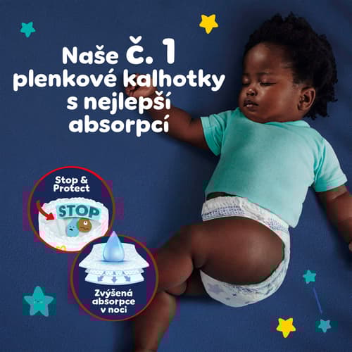 Plenkové kalhotky Pampers Night Pants poskytují až 12hodinovou kompletní extra ochranu proti protečení pro klidný spánek po celou noc. Nyní totiž přicházejí s kapsou Stop & Protect, která pomáhá předcházet protečení vzadu.