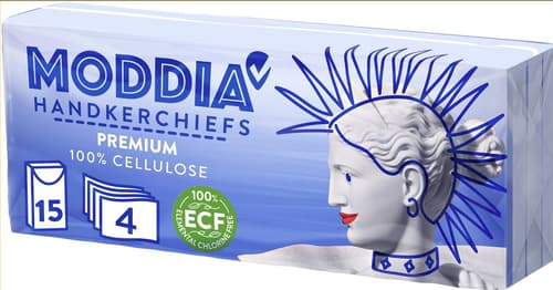 Moddia bílé papírové kapesníky čtyřvrstvé, vhodné pro citlivou pokožku. Krabička obsahuje 15 balíčků, každý po 10 kusech.