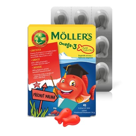 Doplněk stravy. Mollers Omega 3 Želé rybičky jsou doplněk stravy, který obsahují koncentrovaný rybí olej s vitaminem D. Želé tablety mají malinovou příchuť. Účinné látky: Omega 3 (DHA a EPA) a Vitamin D. Vitamin D přispívá k normální funkci imunitního systému a k udržení normálního stavu kostí a zubů. EPA a DHA přispívají k normální činnosti srdce.* *příznivého účinku se dosáhne při přívodu 250 mg EPA a DHA denně. Nepřekračujte doporučené denní dávkování. Uchovávejte mimo dosah dětí. Doplňky stravy nejsou náhradou pestré stravy. Není vhodné pro děti do 3 let. Obsahuje sladidlo. Nadměrná konzumace může vyvolat projímavé účinky. Balení obsahuje 45 ks želé rybiček.