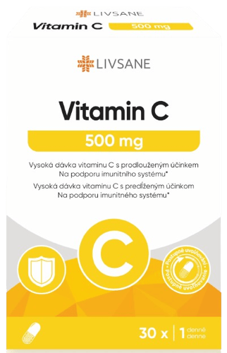 Doplněk stravy. Doplněk stravy s vitaminem C. Naše tělo si je nedokáže samo vytvořit, proto je vhodné zajistit jeho příjem potravou nebo doplňky stravy. Zejména v chladném období v případě fyzické či psychické zátěže a nevyvážené stravy je třeba dbát na dostatečný přísun vitaminu C. Livsane vitamin C 500 mg dodává tělu vitamin C ve vysokých dávkách po dobu několika hodin. Lidský organismus není schopen si ukládat vitamin C po delší dobu. Vitamin C přispívá k normální funkci imunitního systému, a to i během intenzivního fyzického výkonu a po něm, k normálnímu energetickému metabolismu, ke snížení míry únavy a vyčerpání. Vitamin C přispívá k normální psychické činnosti. Bez lepku a laktózy, vhodné pro vegetariány. Nepřekračujte doporučené denní dávkování. Uchovávejte mimo dosah dětí. Doplňky stravy nejsou náhradou pestré stravy. Balení obsahuje 30 tobolek. Hmotnost obsahu 20 g.