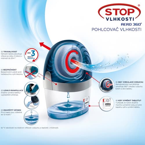 Pohlcovač vlhkosti AERO 360° v modré barvě. Napomáhá optimalizovat nadbytečnou vlhkost a neutralizuje pachy prostřednictvím proudění vzduchu.