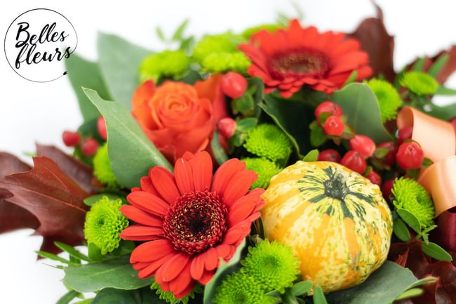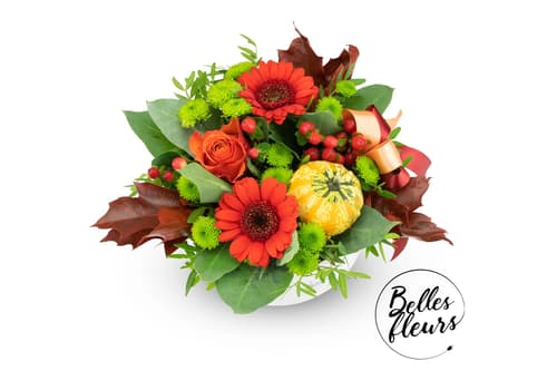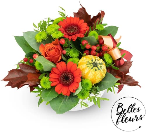 Dominantním prvkem je mini dýně s dlouhou trvanlivostí, v kombinaci s červeno-zelenými barvami působí krásným podzimním dojmem. Květiny jsou vypichovány v aranžovací hmotě do které stačí pouze dolévat vodu a vydrží vám tak dělat radost 7 až 10 dní.