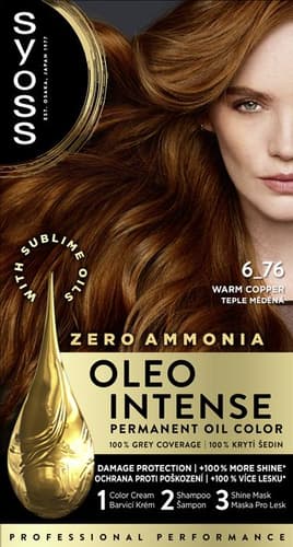 Barva na vlasy Syoss Oleo Intense v teplém měděném odstínu pro olejem posílené dlouhotrvající barvení bez amoniaku a pocit silných a zdravých vlasů. Pečující receptura pomáhá barevným pigmentům proniknout hluboko do vlasových vláken pro sytou, dlouhotrvající barvu a 100% krytí šedin.