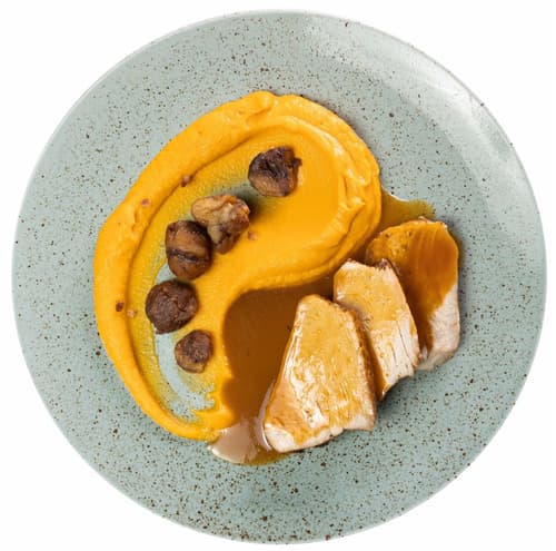 Pečená krůta, pomerančová omáčka, dýňové pyré a pečené kaštany od Petra Bureše
