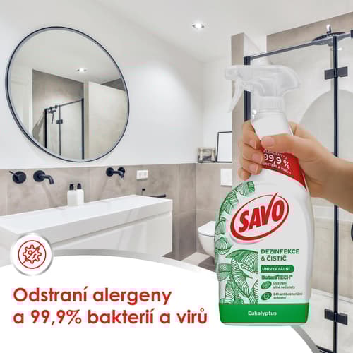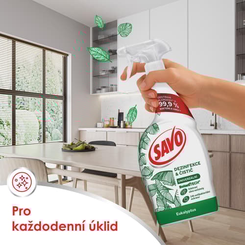 Vyzkoušejte Savo BotaniTech univerzální sprej, který účinně čistí i dezinfikuje. Svěží vůně eukalyptu provoní celou vaši domácnost. Vůně je 100% biorozložitelná a sprej je dermatologicky testován.