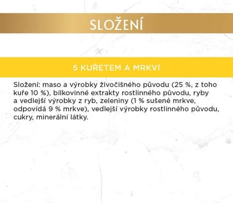 Maso a výrobky živočišného původu (z toho kuře 4 %), bílkovinné extrakty rostlinného původu, ryby a vedlejší výrobky z ryb, vedlejší výrobky rostlinného původu, zeleniny (1 % dehydrované mrkve, odpovídá 9 % mrkve), minerální látky, cukry