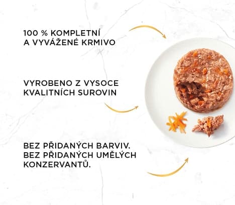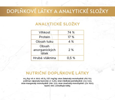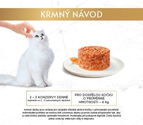 Krmný návod: Dospělou kočku o průměrné hmotnosti (4 kg) krmte 2 až 3 konzervami denně, nejméně ve dvou samostatných dávkách (porcích). Podávejte při pokojové teplotě. Čistá čerstvá pitná voda by měla být vždy k dispozici.