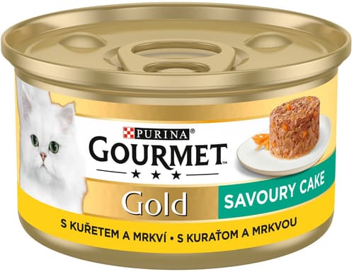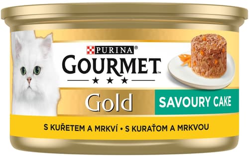 Gourmet Gold Savoury Cake představuje jemně pokrájené kouskys hovězím, kuřetem nebo jinými vytříbenými příchutěmi, pečlivě ochucené jen špetkou omáčky. To vše se snoubí v lahodný dortík a vaše kočka si tak může vychutnat každé sousto.
