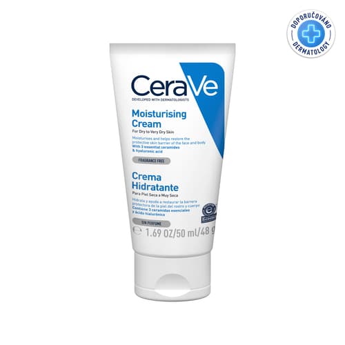 CeraVe Hydratační krém pro suchou až velmi suchou pokožku. Hydratuje a pomáhá obnovit ochrannou kožní bariéru na obličeji a těle. Vhodné pro dospělé i děti. Bez parfemace, nekomedogenní, hypoalergenní. Velikost balení 50 ml.