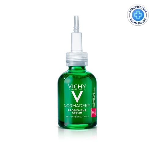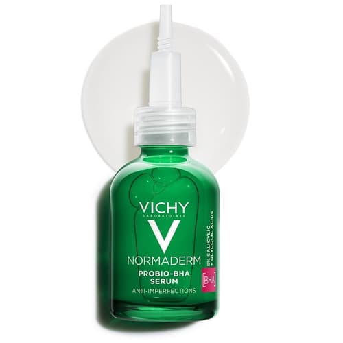 VICHY NORMADERM PROBIO-BHA každodenní peelingové sérum koriguje nedokonalosti pleti způsobené vlivem hormonálního akné. Obsahuje kombinaci dermokyselin a probiotických frakcí pro zmírnění nedokonalostí a zlepšení kvality pleti. Upravuje výsev akné, černé tečky a viditelné póry. Dále snižuje nadměrné množství kožního mazu. Obnovuje texturu pleti a urychluje její hojení. Také pleť hydratuje po celý den a působí proti recidivě. Lehká, nemastná a nekomedogenní textura se rychle vstřebává do pleti a díky obsahu mentolu okamžitě navozuje pocit svěžesti. Pleť po aplikaci vypadá obnovená a působí zdravější. Dermatologicky testováno. Hypoalergenní. Vhodné pro mastnou, problematickou a citlivou pleť. Balení obsahuje 30 ml.