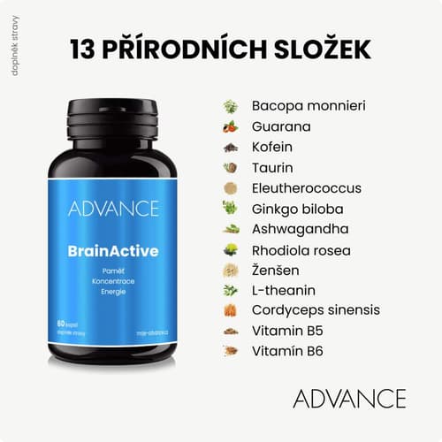 Doplněk stravy. Advance BrainActive je doplněk stravy, který obsahuje ginkgo, bacopu, kofein, guaranu, taurin, ženšen, eleuterokok, cordyceps a další přírodní látky. Bacopa, ženšen a guarana podporují paměť. Ginkgo biloba, bacopa, rhodiola a ženšen podporují kognitivní funkce. Bacopa podporuje schopnost soustředění. Guarana podporuje energii. Ženšen a vitaminy B5 a B6 přispívají ke snížení míry únavy a vyčerpání. Rhodiola, guarana a bacopa podporují odolnost organismu vůči stresu. Guarana, ženšen a rhodiola podporují duševní výkonnost. Nepřekračujte doporučené denní dávkování. Uchovávejte mimo dosah dětí. Doplňky stravy nejsou náhradou pestré a vyvážené stravy. Balení obsahuje 60 kapslí. Hmotnost obsahu: 31 g.