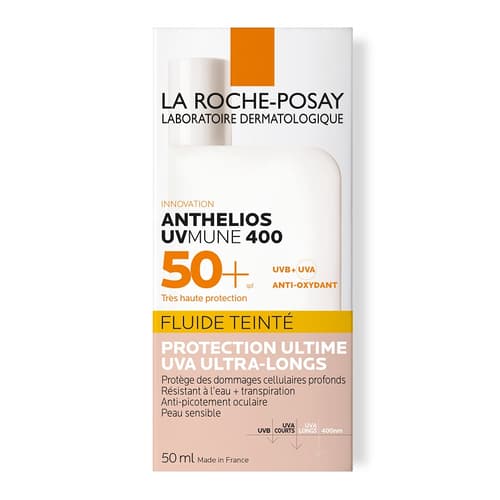 LA ROCHE-POSAY ANTHELIOS UVMUNE 400 tónovaný fluid SPF 50 s ultimátním UV filtrem chránícím před dlouhovlnným UVA zářením má velmí vysokou UVA/UVB ochrana. Velmi odolný vůči vodě a písku. Navržen tak, aby zamezil štípání v očích. Pomáhá předcházet oxidativnímu stresu vzniklému v důsledku infračerveného záření A a znečištění. Citlivá pleť a pleť se sluneční intolerancí. Pro všechny typy pleti. Balení obsahuje 50 ml.