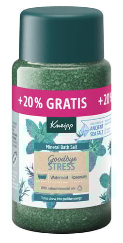 Koupelová sůl Goodbye stress s vůní vodní máty a rozmarýnu v ekologickém balení. Přírodní sůl pochází z termálních pramenů Luisenhall v Evropě a díky své struktuře zajišťuje vysokou absorbci éterických olejů.