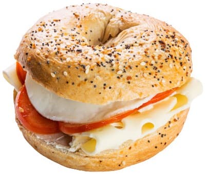 Pappudia Bagel se sázeným vejcem, ementálem a rajčetem