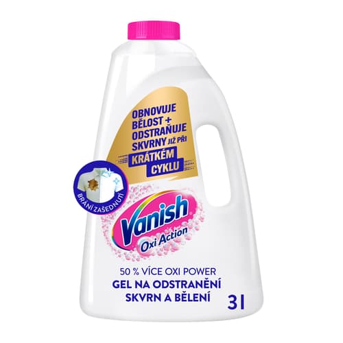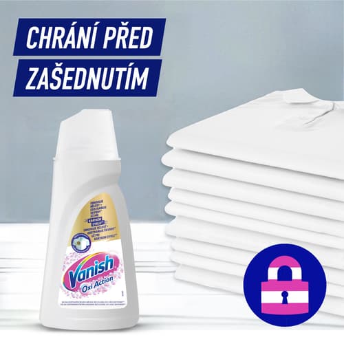 Vanish Oxi action udržuje při pravidelném používání vaše bílé oblečení zářivě bílé i po 50. vyprání*. Odstraňuje skvrny, minimalizuje nepříjemný zápach a dodává hygienickou čistotu. Neobsahuje chlór a díky své technologii "Oxi action" na bázi aktivního kyslíku je šetrný k běžným textiliím jako je bavlna nebo polyester.